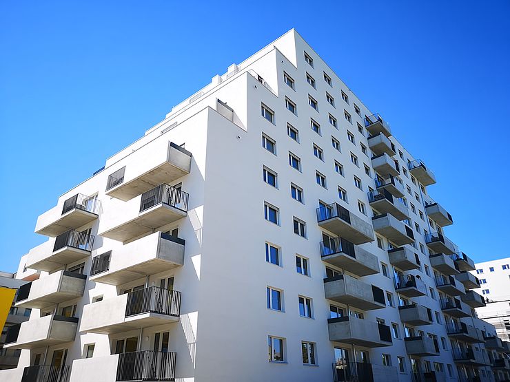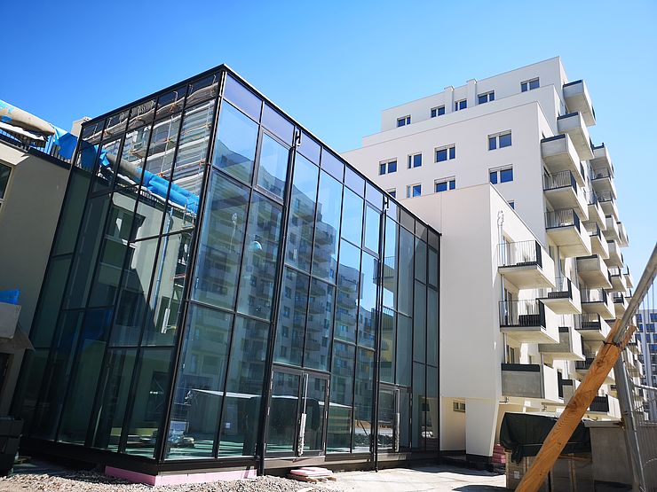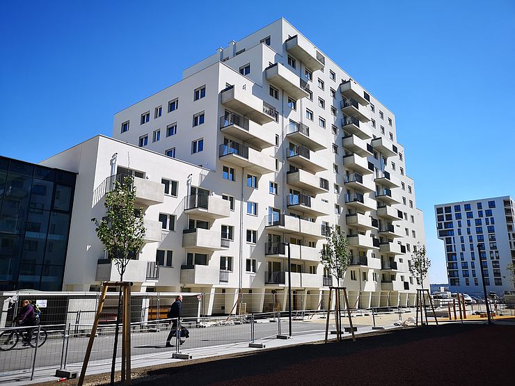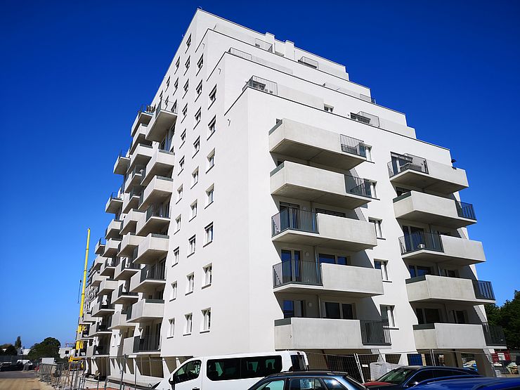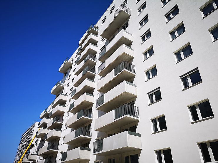 Die Fassadenarbeiten sind bereits weitgehend fertiggestellt und so erstrahlt ein Bauteil des Wohnbauprojekts am Helene-Thimig-Weg schon in voller Pracht. Die derzeit schlichte Ansicht wird in Zukunft jedoch weitaus grüner ausfallen, denn die Wohnhausanlage mit über 117 freifinanzierten Eigentumswohnungen wird künftig Teil Europas größter Urban Gardening Siedlung. Die Impressionen bei schönstem Wetter wollen wir euch nicht vorenthalten: