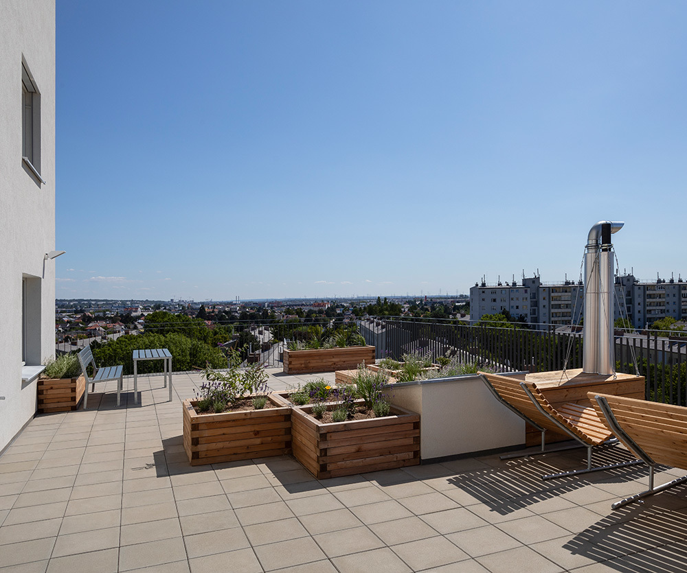 Solche großzügigen Flächen eignen sich bestens als Gemeinschaftsareale, z.B. für nachbarschaftliches Urban-Gardening wie bei unserem Projekt Mischek’s Orangerie. Terrassen, die im Erdgeschoß liegen und zu einer Eigentumswohnung gehören, sind meistens unmittelbar an einen kleinen Eigengarten angeschlossen und bieten Natur de luxe!
