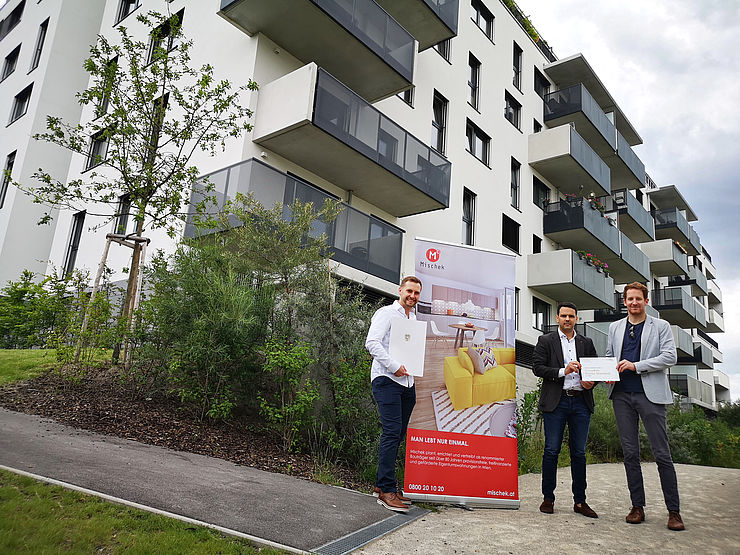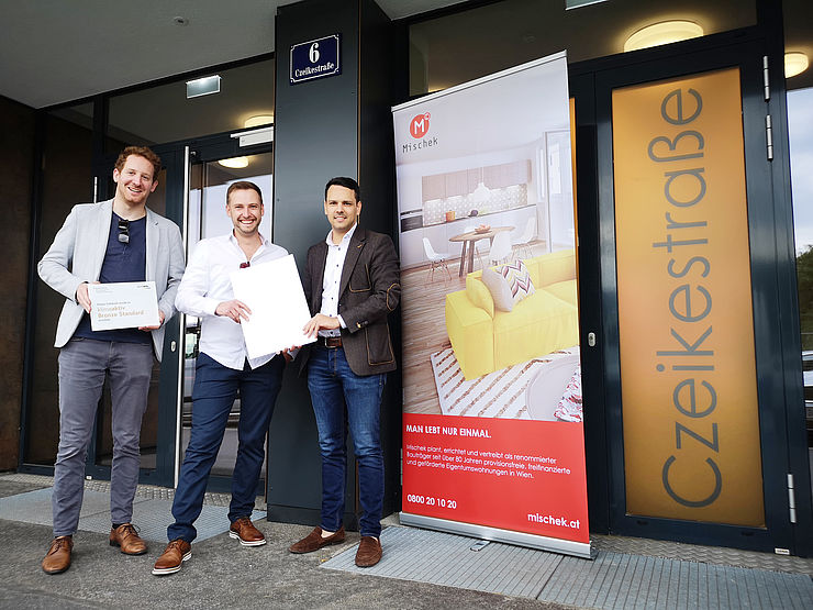 Projektverantwortliche Fabian Regele und Michael Hönigsberger von Mischek bei der Übergabe des Zertifikats an Lukas Eybel von der BONTUS Immobilienverwaltungs GmbH, der die Auszeichnung in Vertretung der Eigentümergemeinschaft übernommen hat.
