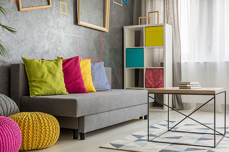 Als Beispiel können hierfür Hängelampen aus getöntem Glas oder bunte Polster in unterschiedlichen Farbtönen bringen. Diese können bewusst als Eye-Catcher dienen und markante Akzente setzen. Wie wäre es zum Beispiel mit den Pantone-Farben des Jahres „Illuminating“ und „Ultimate Grey“? Das grelle Gelb macht in Kombination mit dem schicken Grau jedes Eck eurer Wohnung garantiert zum Blickfang. Achtet aber darauf, dass es nicht zu viel wird: Als Faustregel gilt, dass man nicht mehr als drei Farben pro Raum miteinander kombinieren sollte. So kann man im Home Office zwar die aktivierende Stimmung nutzen, sieht sich aber in seiner Konzentration nicht beeinträchtigt.