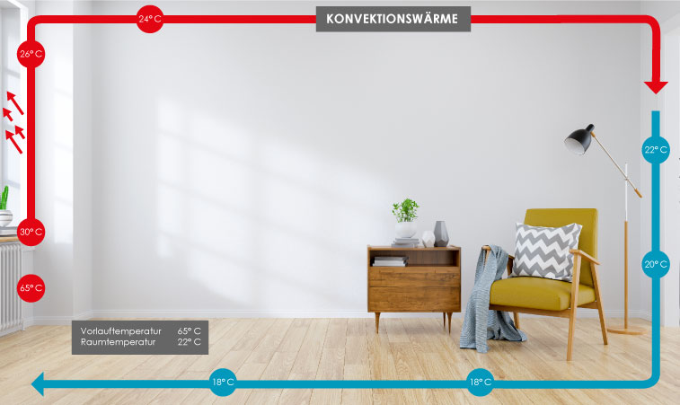 Aufgrund der Tatsache, dass es nur einen Hitzepol im Raum gibt, entsteht eine Luftzirkulation. Die heiße Luft steigt über dem Heizkörper auf, bewegt sich an der Decke entlang und kühlt dabei ab. So kann es zu Temperaturunterschieden innerhalb eines Raums kommen.