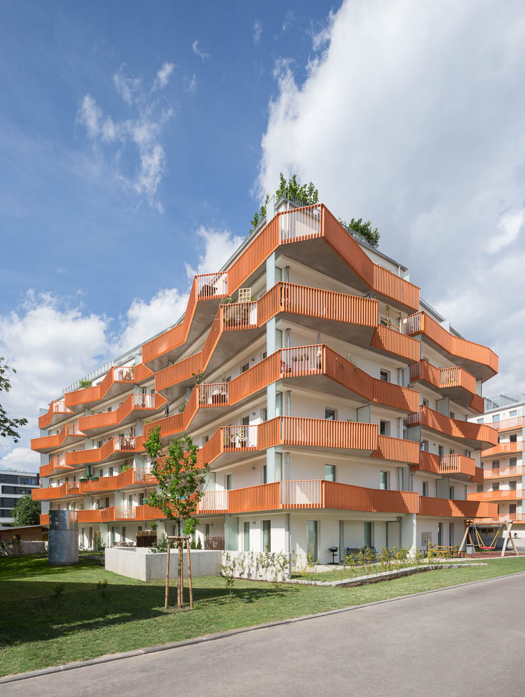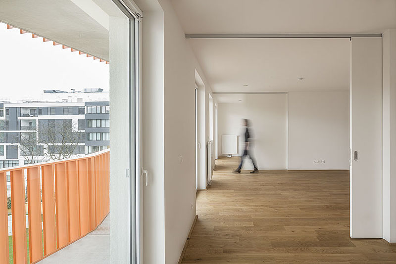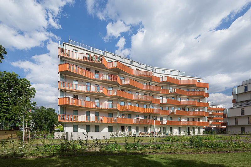 Großes Augenmerk wurde auch auf ein umfangreiches, barrierefreies Freiraumkonzept gelegt: Es gibt unterschiedliche Grünbereiche, Spielflächen und Spielplätze sowie ein Gemeinschaftsgarten bei dem Wohnbauprojekt in Wien 11.