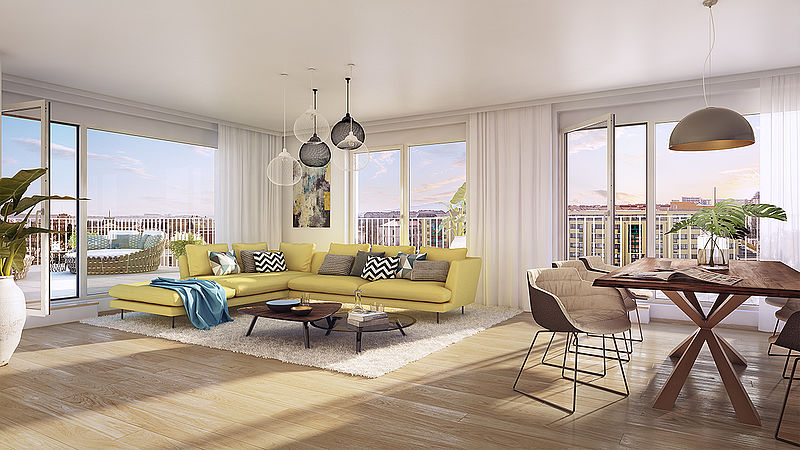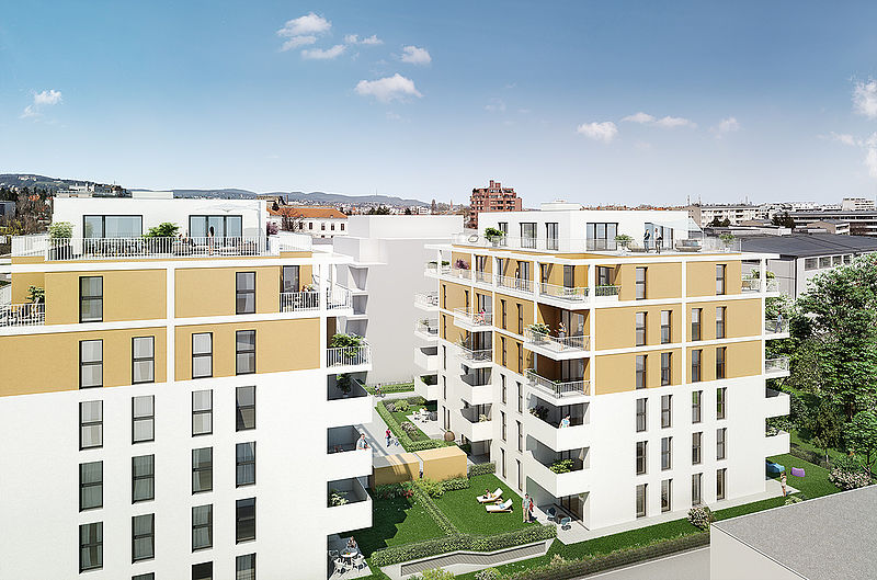 Die Wohnungen in Wien mit 2 - 4 Zimmer (ca. 55 m² - 128 m²) verfügen über Freiflächen wie Loggien, Balkone, Terrassen oder Eigengärten. PKW-Stellplätze befinden sich in der anlageeigenen Garage. Alle Wohnungen verfügen über eine Fußbodenheizung. Handtuchtrockner, Raffstores und eine vorbereitete Kühlung in den Dachgeschoßen komplettieren die erstklassige Ausstattung.