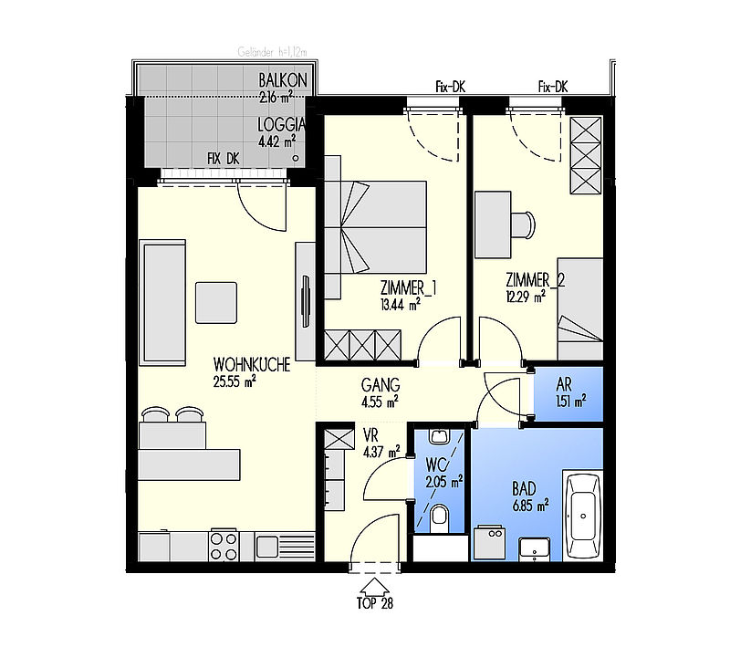 Green Eastside - Leben in der Donaustadt Bertha-von-Suttner-Gasse 4, 1220 Wien Eckdaten Stiege 1 • Stock 3.OG • Top 1-028 Zimmer 3 • Größe 75,03 m²/4,42 m² Loggia/2,16 m² Balkon Bezug geplant Q4/2022 Preis/Finanzierung Gesamtkaufpreis EUR 395.783,25