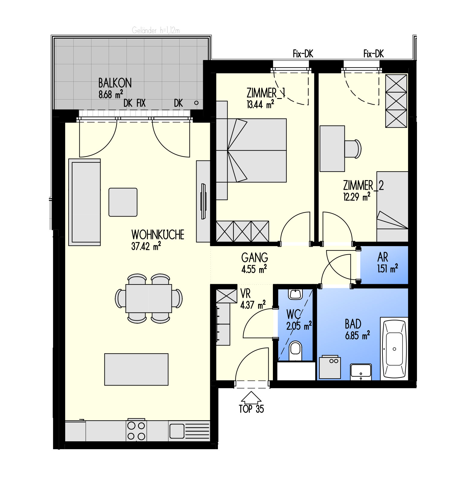 Green Eastside - Leben in der Donaustadt Bertha-von-Suttner-Gasse 4, 1220 Wien Eckdaten Stiege 1 • Stock 4.OG • Top 1-035 Zimmer 3 • Größe 82,48 m²/8,68 m² Balkon Bezug geplant Q4/2022 Preis/Finanzierung Gesamtkaufpreis EUR 435.082,00