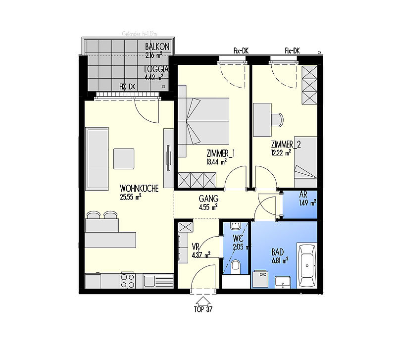 Green Eastside - Leben in der Donaustadt Bertha-von-Suttner-Gasse 4, 1220 Wien Eckdaten Stiege 1 • Stock 4.OG • Top 1-037 Zimmer 3 • Größe 74,9 m²/4,42 m² Loggia/2,16 m² Balkon Bezug geplant Q4/2022 Preis/Finanzierung Gesamtkaufpreis EUR 402.587,50