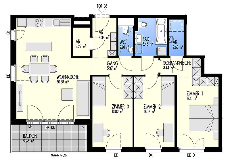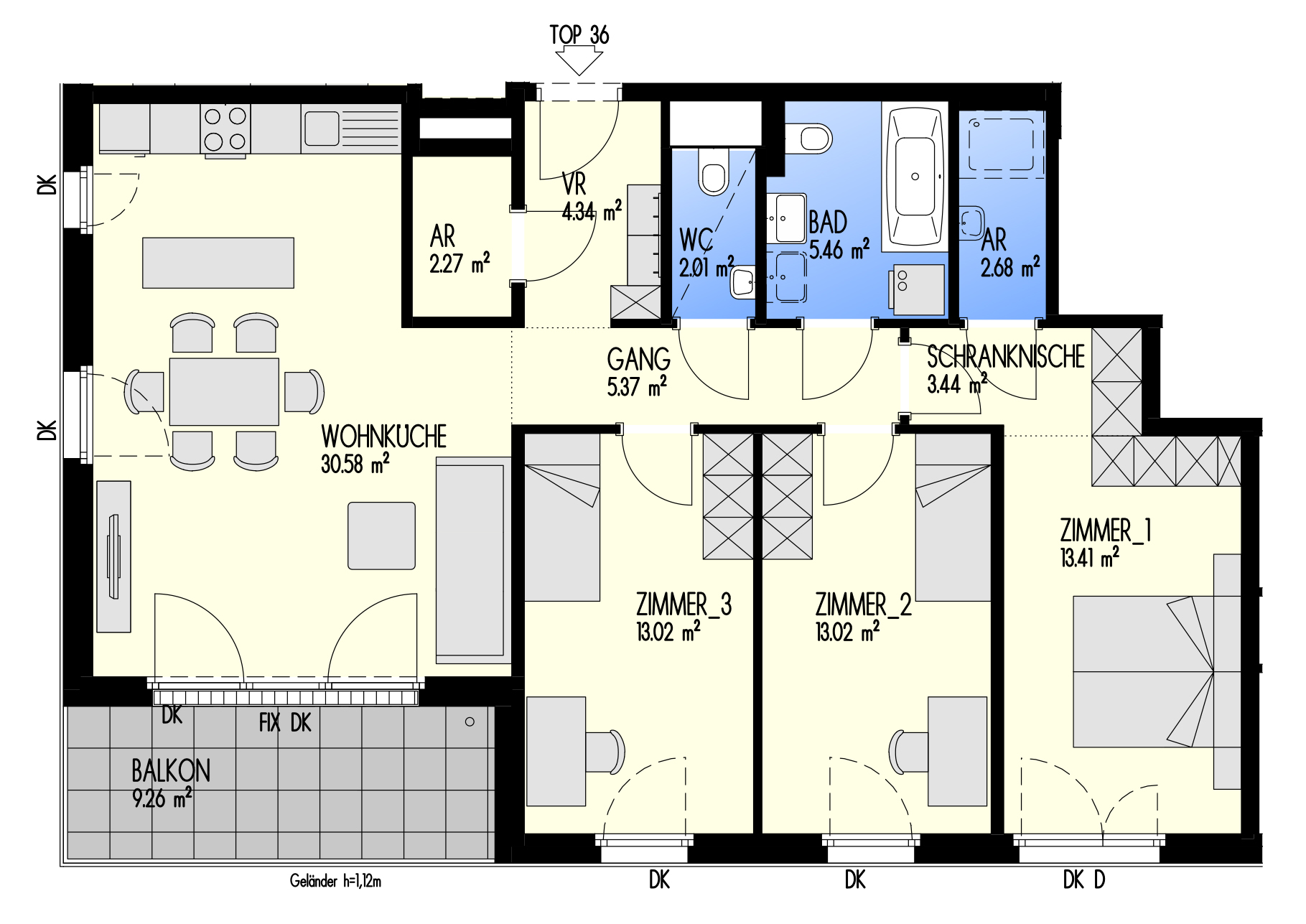 Green Eastside - Leben in der Donaustadt Bertha-von-Suttner-Gasse 4, 1220 Wien Eckdaten Stiege 2 • Stock 5.OG • Top 2-036 Zimmer 4 • Größe 95,6 m²/9,26 m² Balkon Bezug geplant Q4/2022 Preis/Finanzierung Gesamtkaufpreis EUR 523.410,00