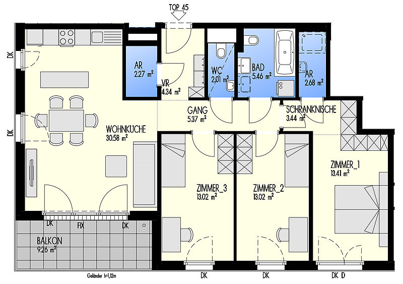 Green Eastside - Leben in der Donaustadt Bertha-von-Suttner-Gasse 4, 1220 Wien Eckdaten Stiege 2 • Stock 6.OG • Top 2-045 Zimmer 4 • Größe 95,6 m²/9,26 m² Balkon Bezug geplant Q4/2022 Preis/Finanzierung Gesamtkaufpreis EUR 532.970,00