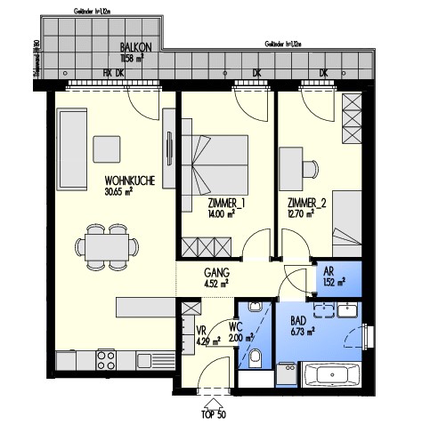 Green Eastside - Leben in der Donaustadt Bertha-von-Suttner-Gasse 4, 1220 Wien Eckdaten Stiege 2 • Stock 6.OG • Top 2-050 Zimmer 3 • Größe 76,41 m²/11,58 m² Balkon Bezug geplant Q4/2022 Preis/Finanzierung Gesamtkaufpreis EUR 437.447,25