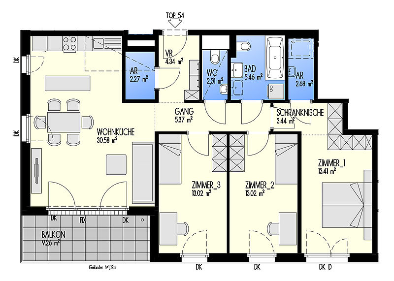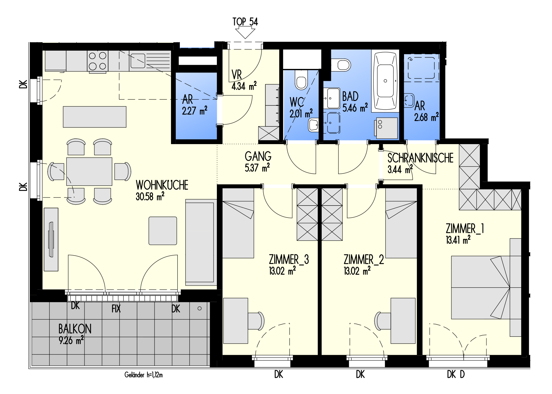 Green Eastside - Leben in der Donaustadt Bertha-von-Suttner-Gasse 4, 1220 Wien Eckdaten Stiege 2 • Stock 7.OG • Top 2-054 Zimmer 4 • Größe 95,6 m²/9,26 m² Balkon Bezug geplant Q4/2022 Preis/Finanzierung Gesamtkaufpreis EUR 542.530,00