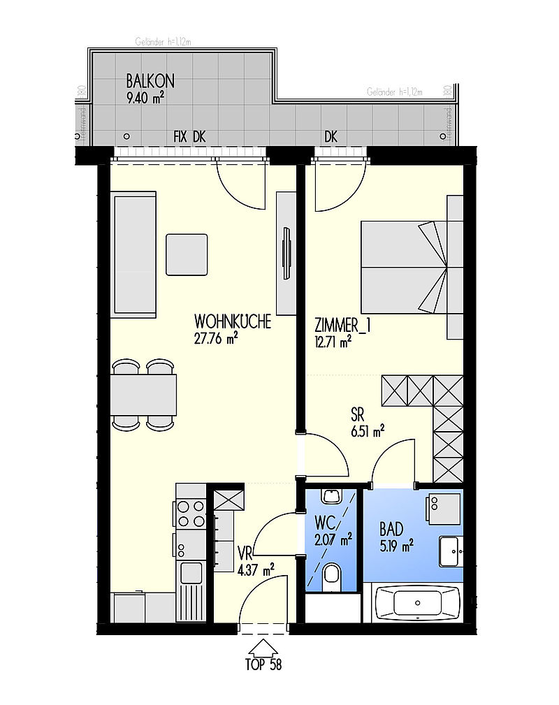 Green Eastside - Leben in der Donaustadt Bertha-von-Suttner-Gasse 4, 1220 Wien Eckdaten Stiege 2 • Stock 7.OG • Top 2-058 Zimmer 2 • Größe 58,61 m²/9,40 m² Balkon Bezug geplant Q4/2022 Preis/Finanzierung Gesamtkaufpreis EUR 332.611,75