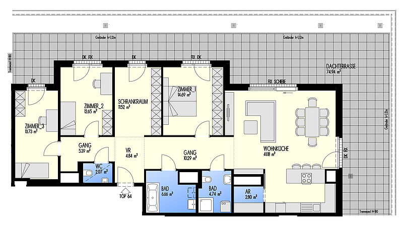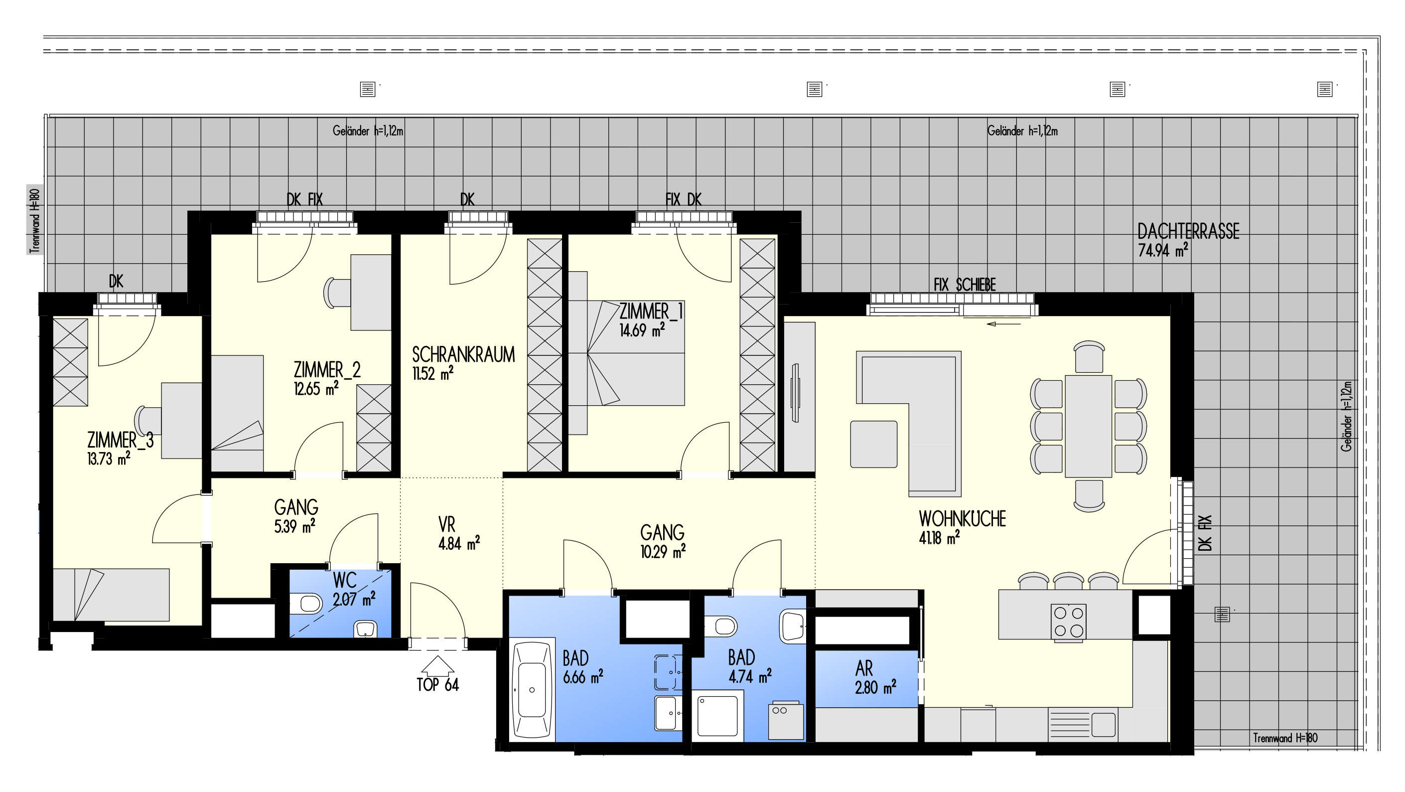 Green Eastside - Leben in der Donaustadt Bertha-von-Suttner-Gasse 4, 1220 Wien Eckdaten Stiege 2 • Stock DG • Top 2-064 Zimmer 4 • Größe 130,56 m²/74,94 m² Terrasse Bezug geplant Q4/2022 Preis/Finanzierung Gesamtkaufpreis EUR 889.113,60