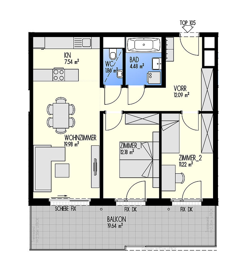 Green Eastside - Leben in der Donaustadt Bertha-von-Suttner-Gasse 4, 1220 Wien Eckdaten Stiege 3 • Stock 10.OG • Top 3-105 Zimmer 3 • Größe 69,35 m²/19,64 m² Balkon Bezug geplant Q4/2022 Preis/Finanzierung Gesamtkaufpreis EUR 484.756,50