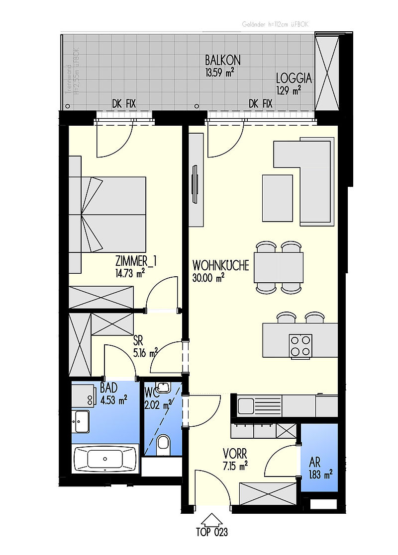 Green Eastside - Leben in der Donaustadt Bertha-von-Suttner-Gasse 4, 1220 Wien Eckdaten Stiege 3 • Stock 1.OG • Top 3-023 Zimmer 2 • Größe 66,71 m²/1,29 m² Loggia/13,59 m² Balkon Bezug geplant Q4/2022 Preis/Finanzierung Gesamtkaufpreis EUR 335.217,75