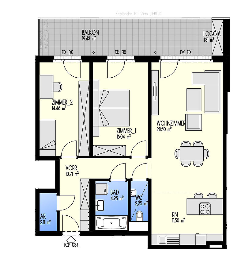 Green Eastside - Leben in der Donaustadt Bertha-von-Suttner-Gasse 4, 1220 Wien Eckdaten Stiege 3 • Stock 2.OG • Top 3-034 Zimmer 3 • Größe 91,83 m²/1,31 m² Loggia/19,43 m² Balkon Bezug geplant Q4/2022 Preis/Finanzierung Gesamtkaufpreis EUR 470.628,75