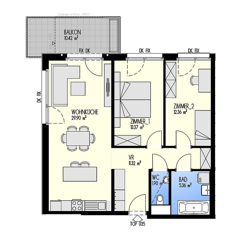 Green Eastside - Leben in der Donaustadt Bertha-von-Suttner-Gasse 4, 1220 Wien Eckdaten Stiege 3 • Stock 3.OG • Top 3-035 Zimmer 3 • Größe 74,21 m²/10,42 m² Balkon Bezug geplant Q4/2022 Preis/Finanzierung Gesamtkaufpreis EUR 391.457,75