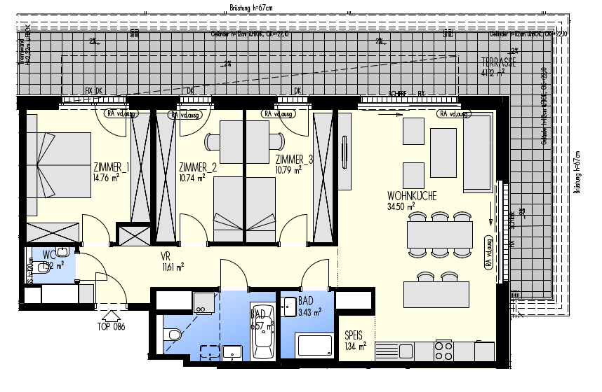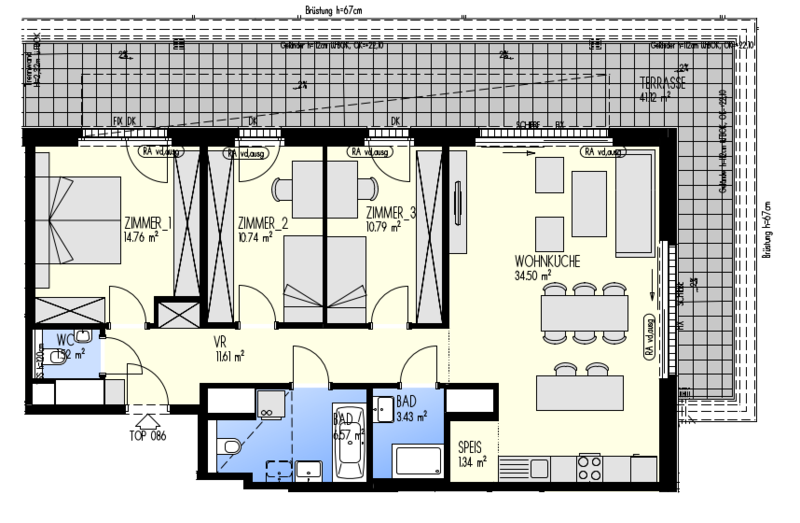 Green Eastside - Leben in der Donaustadt Bertha-von-Suttner-Gasse 4, 1220 Wien Eckdaten Stiege 3 • Stock 7.OG • Top 3-086 Zimmer 4 • Größe 95,26 m²/41,12 m² Terrasse Bezug geplant Q4/2022 Preis/Finanzierung Gesamtkaufpreis EUR 647.848,80