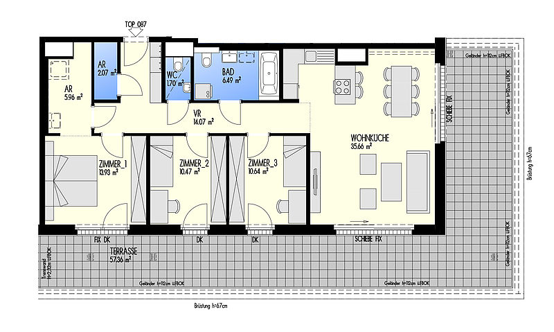 Green Eastside - Leben in der Donaustadt Bertha-von-Suttner-Gasse 4, 1220 Wien Eckdaten Stiege 3 • Stock 7.OG • Top 3-087 Zimmer 4 • Größe 100,99 m²/57,36 m² Terrasse Bezug geplant Q4/2022 Preis/Finanzierung Gesamtkaufpreis EUR 669.563,70