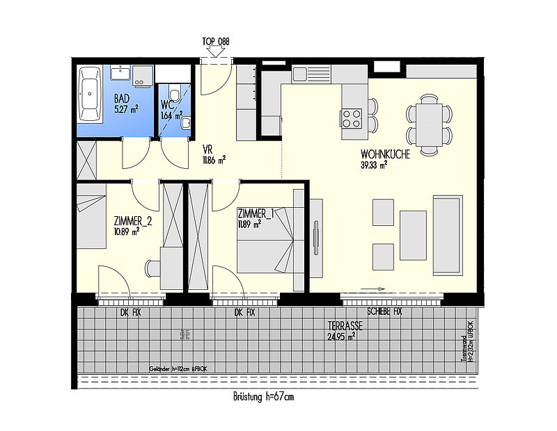 Green Eastside - Leben in der Donaustadt Bertha-von-Suttner-Gasse 4, 1220 Wien Eckdaten Stiege 3 • Stock 7.OG • Top 3-088 Zimmer 3 • Größe 80,88 m²/24,95 m² Terrasse Bezug geplant Q4/2022 Preis/Finanzierung Gesamtkaufpreis EUR 520.058,40