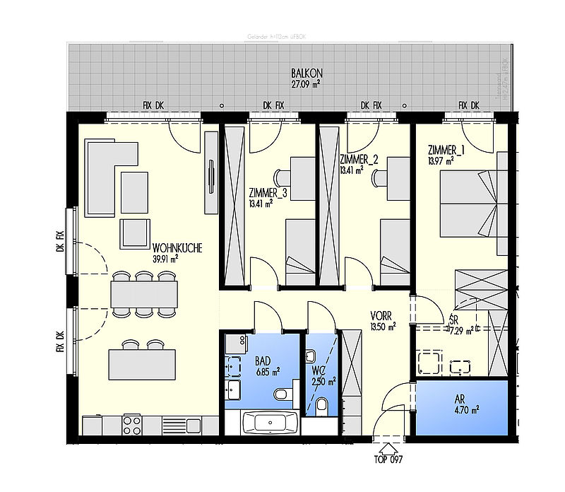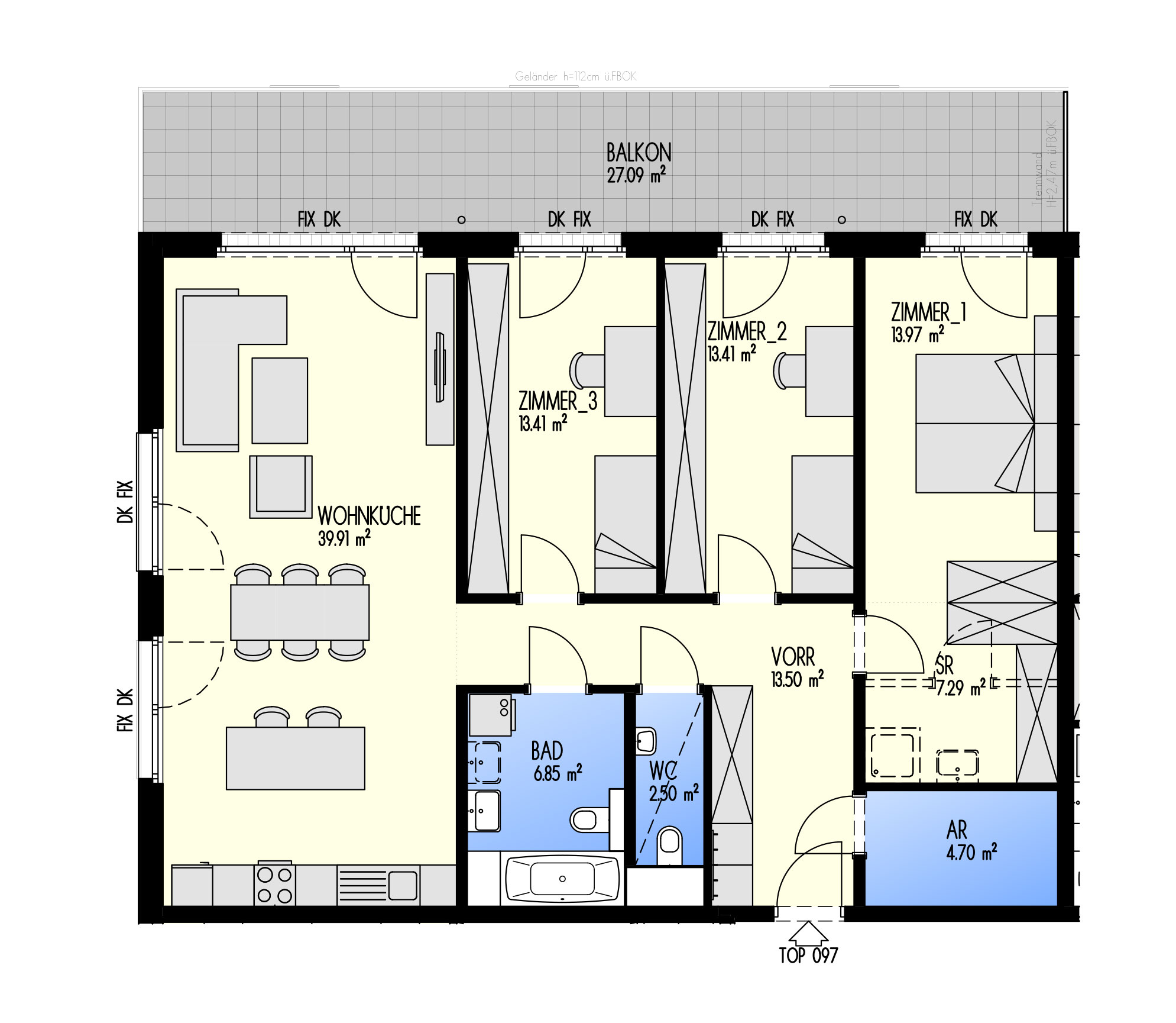 Green Eastside - Leben in der Donaustadt Bertha-von-Suttner-Gasse 4, 1220 Wien Eckdaten Stiege 3 • Stock 8.OG • Top 3-097 Zimmer 4 • Größe 115,54 m²/27,09 m² Balkon Bezug geplant Q4/2022 Preis/Finanzierung Gesamtkaufpreis EUR 667.243,50