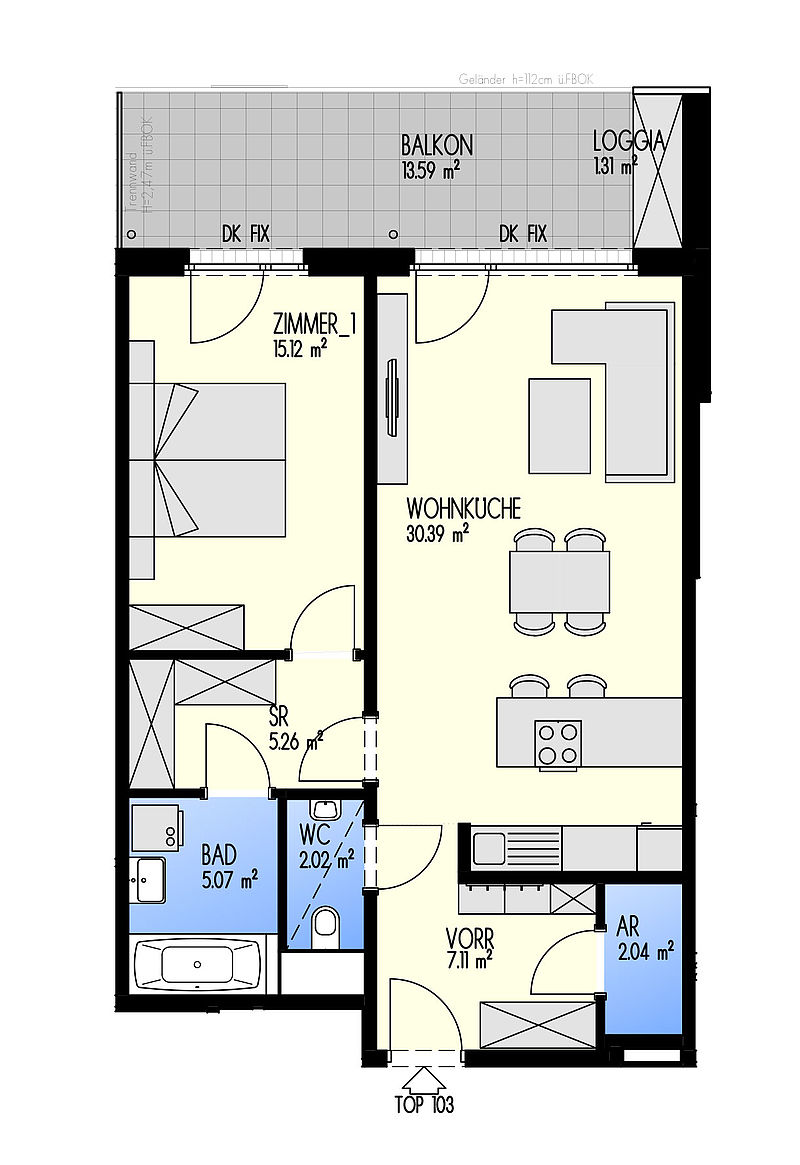Green Eastside - Leben in der Donaustadt Bertha-von-Suttner-Gasse 4, 1220 Wien Eckdaten Stiege 3 • Stock 9.OG • Top 3-103 Zimmer 2 • Größe 68,32 m²/1,31 m² Loggia/13,59 m² Balkon Bezug geplant Q4/2022 Preis/Finanzierung Gesamtkaufpreis EUR 397.964,00
