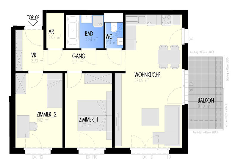 Garten-Städtchen-22 – Wohnen am Fliedergarten Marlen-Haushofer-Weg 2 & 4 (Raffenstättergasse) , 1220 Wien Eckdaten Haus 2 • Stock 1.OG • Top 2-08 Zimmer 3 • Größe 69,16 m²/8,4 m² Balkon Bezug geplant Anfang 2023 Preis/Finanzierung Gesamtkaufpreis EUR 348.000,00