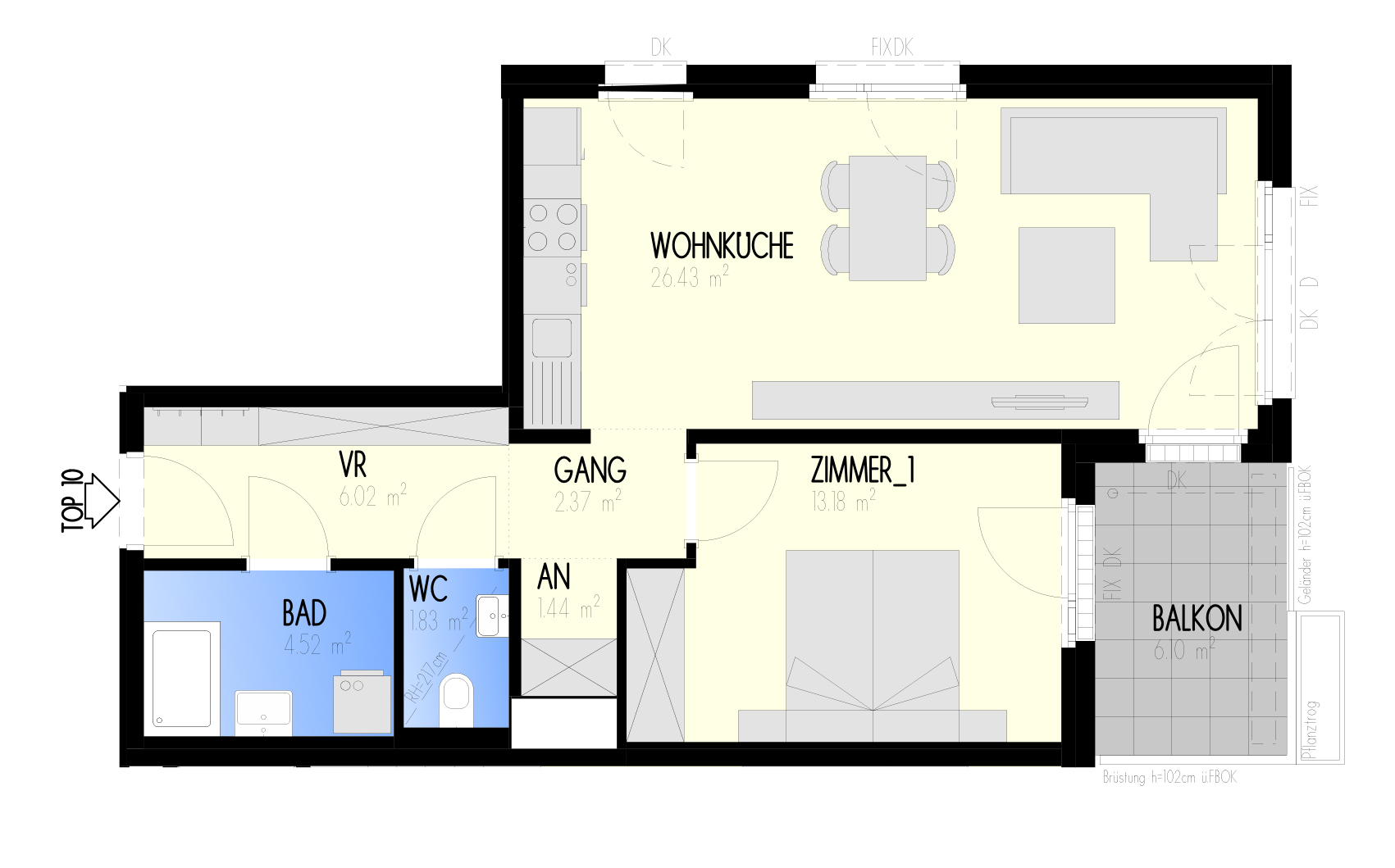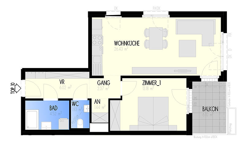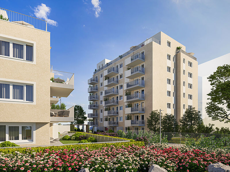 Garten-Städtchen-22 – Wohnen am Fliedergarten Marlen-Haushofer-Weg 2 & 4 (Raffenstättergasse) , 1220 Wien Eckdaten Haus 4 • Stock 1.OG • Top 4-10 Zimmer 2 • Größe 55,79 m²/6,1 m² Balkon Bezug geplant Anfang 2023 Preis/Finanzierung Gesamtkaufpreis EUR 242.000,00