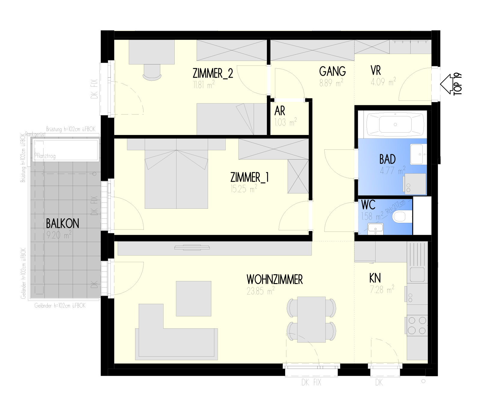 Garten-Städtchen-22 – Wohnen am Fliedergarten Marlen-Haushofer-Weg 2 & 4 (Raffenstättergasse) , 1220 Wien Eckdaten Haus 4 • Stock 3.OG • Top 4-19 Zimmer 3 • Größe 78,55 m²/9,2 m² Balkon Bezug geplant Anfang 2023 Preis/Finanzierung Gesamtkaufpreis EUR 382.000,00