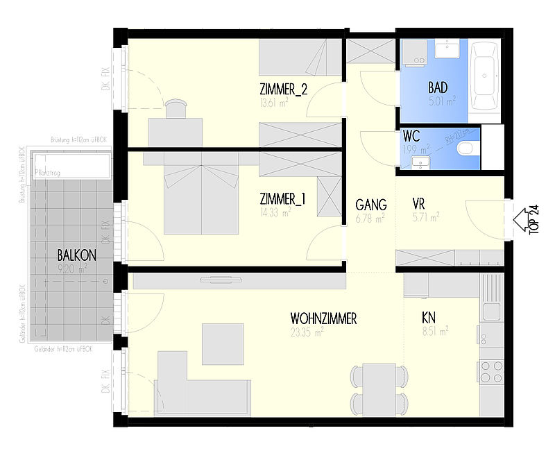Garten-Städtchen-22 – Wohnen am Fliedergarten Marlen-Haushofer-Weg 2 & 4 (Raffenstättergasse) , 1220 Wien Eckdaten Haus 4 • Stock 4.OG • Top 4-24 Zimmer 3 • Größe 79,29 m²/9,2 m² Balkon Bezug geplant Anfang 2023 Preis/Finanzierung Gesamtkaufpreis EUR 360.000,00