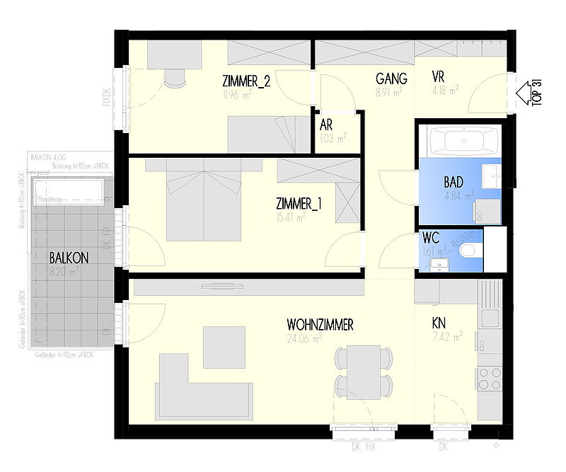 Garten-Städtchen-22 – Wohnen am Fliedergarten Marlen-Haushofer-Weg 2 & 4 (Raffenstättergasse) , 1220 Wien Eckdaten Haus 4 • Stock 5.OG • Top 4-31 Zimmer 3 • Größe 79,42 m²/8,2 m² Balkon Bezug geplant Anfang 2023 Preis/Finanzierung Gesamtkaufpreis EUR 408.000,00