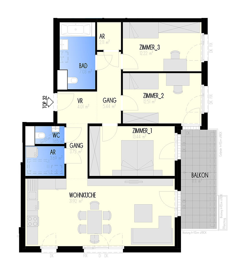 Garten-Städtchen-22 – Wohnen am Fliedergarten Marlen-Haushofer-Weg 2 & 4 (Raffenstättergasse) , 1220 Wien Eckdaten Haus 4 • Stock 5.OG • Top 4-32 Zimmer 4 • Größe 97,74 m²/11,11 m² Balkon Bezug geplant Anfang 2023 Preis/Finanzierung Gesamtkaufpreis EUR 472.000,00