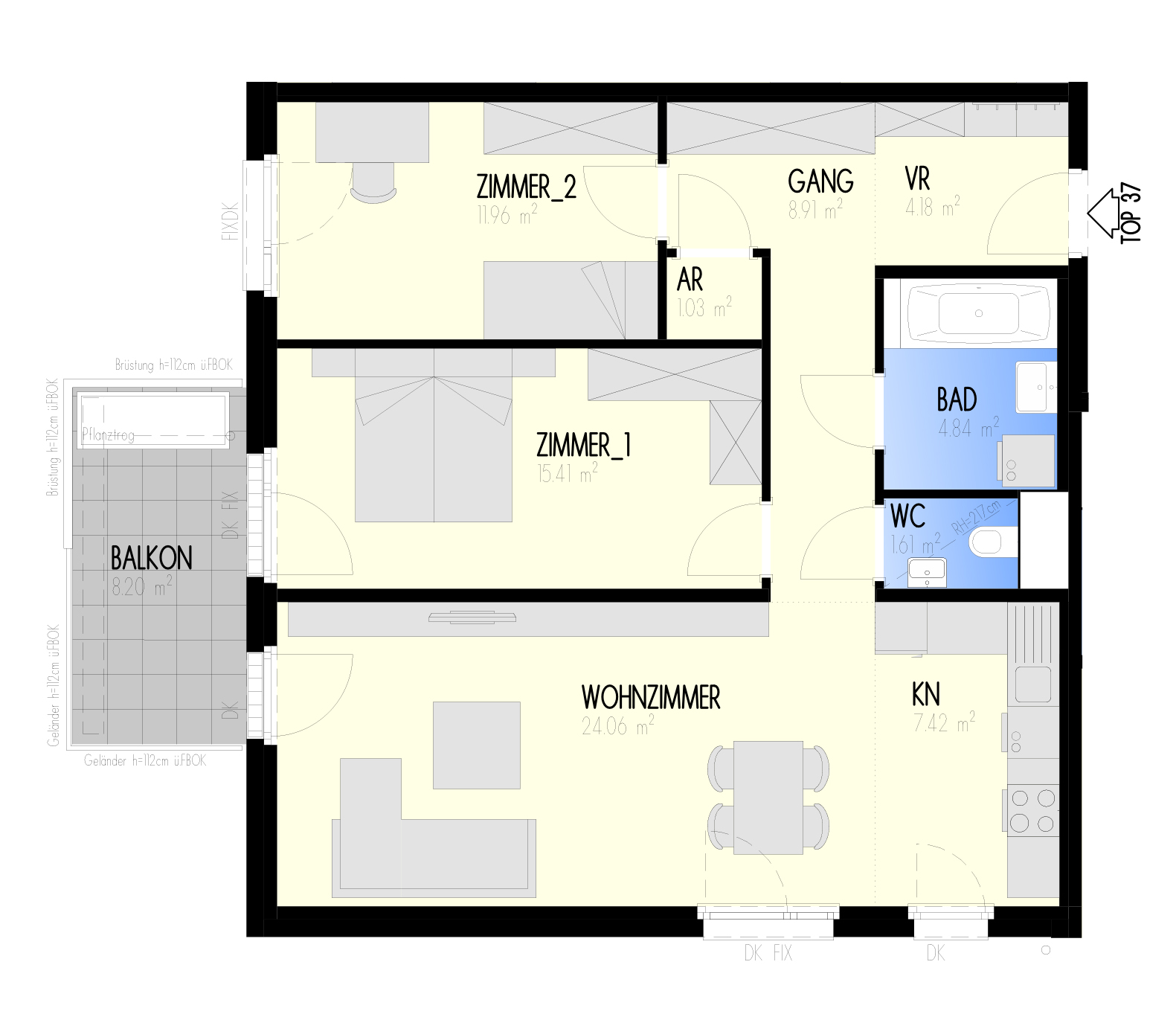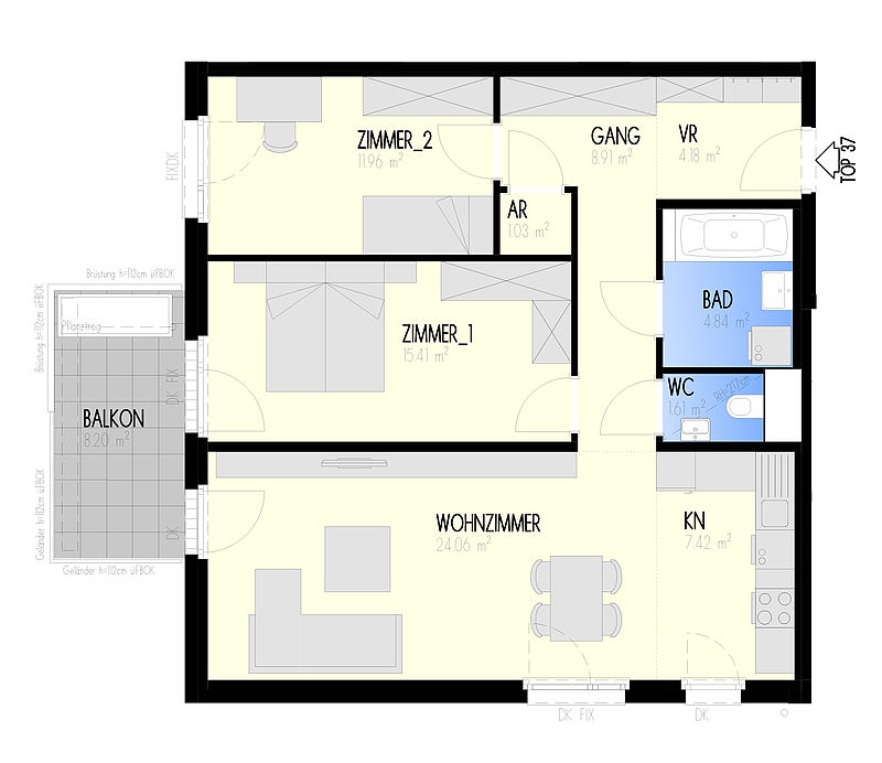Garten-Städtchen-22 – Wohnen am Fliedergarten Marlen-Haushofer-Weg 2 & 4 (Raffenstättergasse) , 1220 Wien Eckdaten Haus 4 • Stock 6.OG • Top 4-37 Zimmer 3 • Größe 79,42 m²/8,2 m² Balkon Bezug geplant Anfang 2023 Preis/Finanzierung Gesamtkaufpreis EUR 428.000,00
