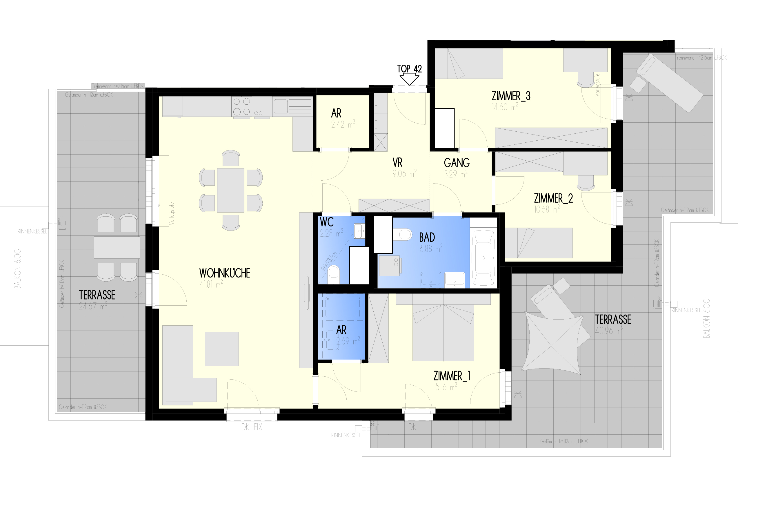 Garten-Städtchen-22 – Wohnen am Fliedergarten Marlen-Haushofer-Weg 2 & 4 (Raffenstättergasse) , 1220 Wien Eckdaten Haus 4 • Stock DG • Top 4-42 Zimmer 4 • Größe 108,87 m²/65,63 m² Dachterrasse Bezug geplant Anfang 2023 Preis/Finanzierung Gesamtkaufpreis EUR 690.000,00