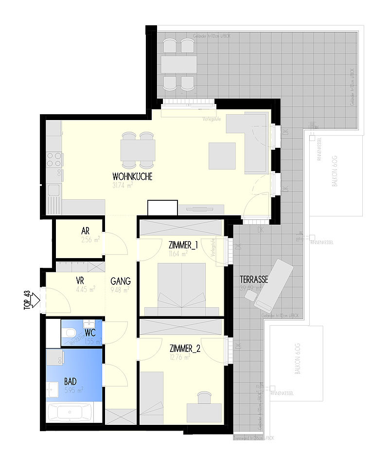 Garten-Städtchen-22 – Wohnen am Fliedergarten Marlen-Haushofer-Weg 2 & 4 (Raffenstättergasse) , 1220 Wien Eckdaten Haus 4 • Stock DG • Top 4-43 Zimmer 3 • Größe 80,13 m²/39,49 m² Dachterrasse Bezug geplant Anfang 2023 Preis/Finanzierung Gesamtkaufpreis EUR 440.000,00